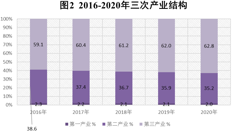 初步核算,全年实现地区生产总值[2]14817.95亿元,比上年增长4.6%。分产业看,第一产业增加值296.80亿元,比上年增长0.9 %;第二产业增加值5214.35亿元,增长5.6%;第三产业增加值9306.80亿元,增长4.1%。三次产业结构调整为2.0:35.2:62.8,第三产业增加值占地区生产总值比重比上年提高0.8个百分点。