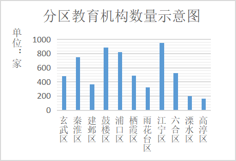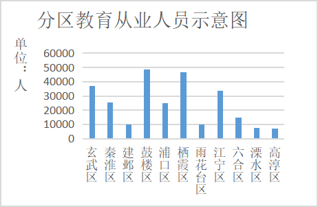 4、区域分布。玄武区各类教育机构485家,从业人员3.70万人。秦淮区各类教育机构752家,从业人员2.55万人。建邺区各类教育机构368家,从业人员1.01万人。鼓楼区各类教育机构887家,从业人员4.88万。浦口区各类教育机构820家,从业人员2.48万人。栖霞区各类教育机构490家,从业人员4.66万人。雨花台区各类教育机构324家,从业人员1.01万人。江宁区各类教育机构951家,从业人员3.34万人。六合区各类教育机构526家,从业人员1.5万人。溧水区各类教育机构202家,从业人员0.77万人。高淳区各类教育机构165家,从业人员0.73万人。