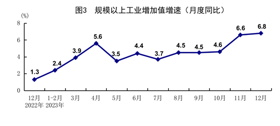 全年全国规模以上工业增加值比上年增长4.6%。分三大门类看,采矿业增加值增长2.3%,制造业增长5.0%,电力、热力、燃气及水生产和供应业增长4.3%。装备制造业增加值增长6.8%,增速比规模以上工业快2.2个百分点。分经济类型看,国有控股企业增加值增长5.0%;股份制企业增长5.3%,外商及港澳台商投资企业增长1.4%;私营企业增长3.1%。分产品看,太阳能电池、新能源汽车、发电机组(发电设备)产品产量分别增长54.0%、30.3%、28.5%。12月份,规模以上工业增加值同比增长6.8%,环比增长0.52%。1—11月份,全国规模以上工业企业实现利润总额69823亿元,同比下降4.4%;其中11月份增长29.5%,连续4个月增长。