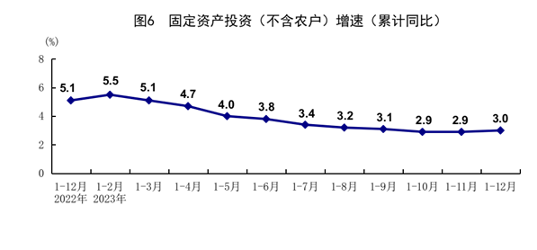 全年全国固定资产投资(不含农户)503036亿元,比上年增长3.0%;扣除价格因素影响,增长6.4%。分领域看,基础设施投资增长5.9%,制造业投资增长6.5%,房地产开发投资下降9.6%。全国商品房销售面积111735万平方米,下降8.5%;商品房销售额116622亿元,下降6.5%。分产业看,第一产业投资下降0.1%,第二产业投资增长9.0%,第三产业投资增长0.4%。民间投资下降0.4%;扣除房地产开发投资,民间投资增长9.2%。高技术产业投资增长10.3%,快于全部投资7.3个百分点。其中,高技术制造业、高技术服务业投资分别增长9.9%、11.4%。高技术制造业中,航空、航天器及设备制造业,计算机及办公设备制造业,电子及通信设备制造业投资分别增长18.4%、14.5%、11.1%;高技术服务业中,科技成果转化服务业、电子商务服务业投资分别增长31.8%、29.2%。12月份,固定资产投资(不含农户)环比增长0.09%。
