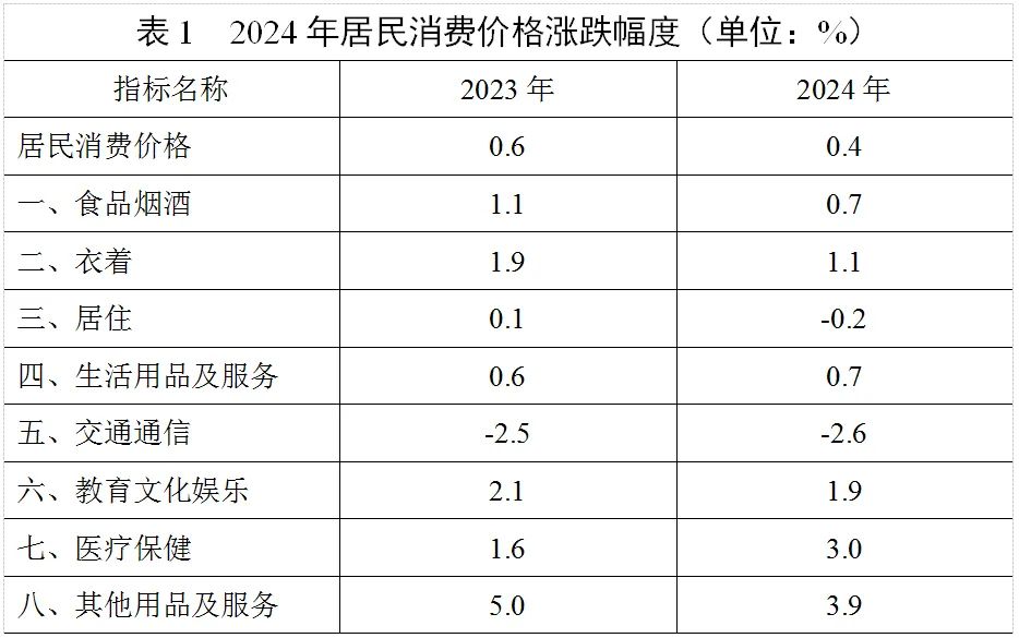 全年居民消费价格比上年上涨0.4%。分类别看,食品烟酒类上涨0.7%,衣着类上涨1.1%,居住类下降0.2%,生活用品及服务类上涨0.7%,交通通信类下降2.6%,教育文化娱乐类上涨1.9%,医疗保健类上涨3.0%,其他用品及服务类上涨3.9%。