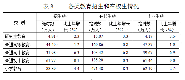 教育事业协调发展。全省共有普通高校134所。普通高等教育本专科招生44.49万人,在校生169.86万人,毕业生47.87万人;研究生教育招生4.91万人,在校生15.07万人,毕业生4.17万人。高等教育毛入学率达51.0%,比上年提高2.4个百分点。全省中等职业教育在校生达72.36万人(不含技工学校)。九年义务教育巩固率100%,高中阶段教育毛入学率99%,基本普及高中阶段教育。特殊教育招生0.34万人,在校生2.24万人。全省共有幼儿园5072所,比上年增加350所;在园幼儿234.13万人,比上年增加2.32万人。