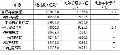 金融信贷规模稳步扩大。年末全省金融机构人民币存款余额107873亿元,比年初增加11766.8亿元,比上年末增长11.7%。其中,住户存款比年初增加2861.5亿元,同比少增1.1亿元;非金融企业存款比年初增加3961.9亿元,同比多增934.0亿元。年末金融机构人民币贷款余额78866.3亿元,比年初增加9285.1亿元,比上年末增长13.4%。其中,中长期贷款比年初增加5960.8亿元,同比多增428.2亿元;短期贷款比年初增加1524.7亿元,同比多增756.2亿元。