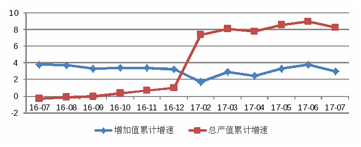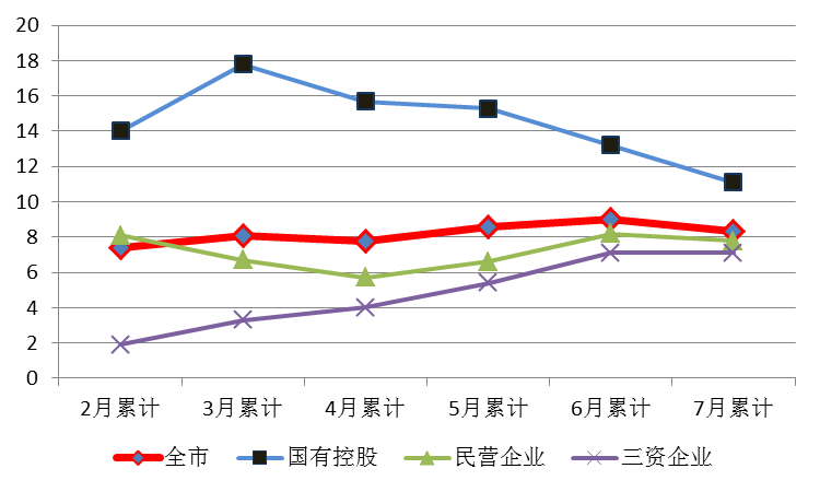 进入下半年首月,全市产值增速有所回落,1-7月的8.3%的增速较上半年9.0%,回落0.7个百分点,主要是7月当月增速回落明显。受高温季节等因素7月全市产值增长3.2%,创下今年月度增速最低。