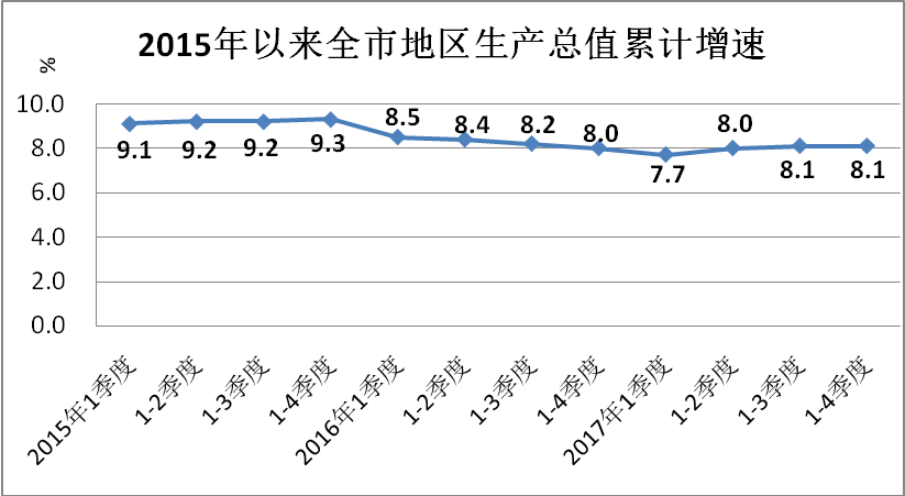 经济运行总体稳定。2017年,全市地区生产总值按可比价格计算,比上年增长8.1%,较2016年提升0.1个百分点。从全年经济运行态势看,一季度增长7.7%,上半年增长8%,前三季度和全年均增长8.1%,增速季度间波动幅度保持在0.4个百分点以内,经济增长稳定性增强。在总体经济平稳运行的背景下,就业形势保持稳定,全年城镇新增就业22.5万人,城镇登记失业率控制在1.82%,连续3年控制在2%以下。居民消费价格低位运行,全年城市居民消费价格总水平同比上涨1.9%,创下2010年以来新低,低于3%的省控年度目标。