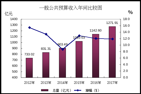 3、2011年以来,一般公共预算收入逐年上台阶。2017年,新一轮税制改革进入攻坚阶段,“营改增”全面施行,在有效减税降负的同时,我市财政收入仍实现了平稳增长,总量规模持续攀升。2011年全市实现一般公共预算收入635.0亿元,2017年1271.91亿元,总量实现了翻番,2012—2017年年均增长12.4%。2012年、2013年、2014年、2015年、2016年、2017年一般公共预算收入总量相继突破了700亿元、800亿元、900亿元、1000亿元、1100亿元和1200亿元大关。