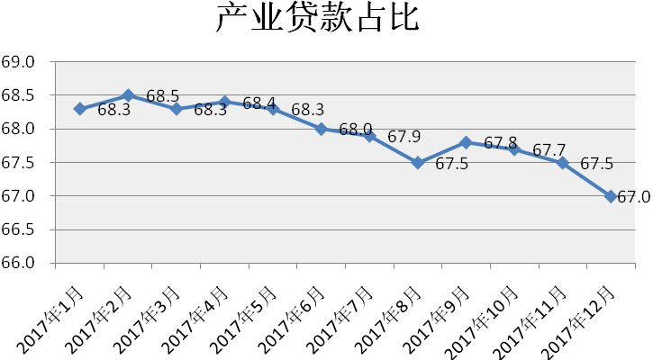 4、2017年产业贷款比重略有下降。2017年,全市产业贷款余额的比重呈现持续下降的趋势。截止2017年12月末,全市产业贷款余额(本外币)为16962.64亿元,比上月末减少31.90亿元,比年初增加1983.94亿元,占各项贷款的比重为67.0%,全市产业贷余额比重继续下降,占比较2017年11月下降0.5个百分点,较2017年初下降1.3个百分点。