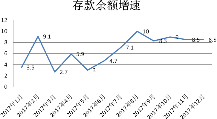 2017年,全市信贷运行总体平稳,各项贷款余额增速全年保持两位数以上,增速呈现出年初增速较高,年末收窄的走势;各项存款余额增速呈现出年初较低,全年保持上升的趋势。
