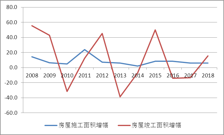 从增速来看,2008年以来,施工面积增幅较为平稳,仅在2011年出现一次峰值,而竣工面积增速呈波浪形前进,稳定度明显弱于施工面积。