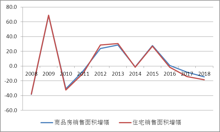 从销售总量看,2008年-2018年间,商品房销售面积从703.55万平方米上升到1224.20万平方米,并在2016年达到1558.18万平方米的峰值,但逐年的增幅波动较大,最大值68.7%和最小值-38.2%相差106.9个百分点。值得关注的是,商品房销售中,住宅所占比例呈不断下降的态势,从2008年的93.7%下降到2018年的80.6%。从销售面积增幅走势图可以看出,商品房销售面积增幅与住宅销售增幅走势基本一致,直到2016年,两条走势线呈现出一个夹角,正是因为住宅销售占比下降造成的。