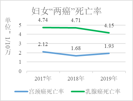 3.妇女常见病的预防干预见效。坚持预防为主,积极普及妇女常见病预防知识,提高自我防范的意识。发挥各级妇幼保健机构职能,定期开展妇女常见病筛查工作,妇女病普查率达到92.56%;全面开展“两癌”筛查工作,积极实施贫困妇女“两癌”救助,提供市级救助10.2万元,力求早发现早治疗。监测显示,宫颈癌死亡率1.93/10万,略有上升;乳腺癌死亡率4.15/10万,较上年下降0.56/10万。