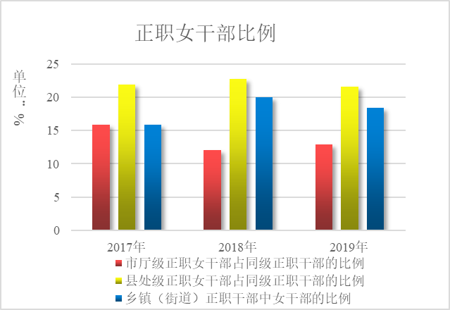 2.各级班子中女干部配备总体稳定。市、区政府领导班子配有女干部的班子比例均保持在100%。市级政府工作部门领导班子配有女干部的比例为65%,其中有10%的领导班子由女同志担任正职。区级政府工作部门领导班子配有正职女干部的比例达到24.14%。当年,市厅级和县处级正职女干部占同级正职干部的比例分别为12.90%、21.60%。另外,乡镇(街道)正职干部中女干部的比例为18.40%,高于《规划》目标8.4个百分点。