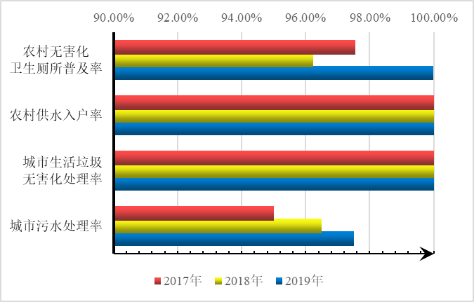 1.生态环境持续改善。加强基本公共环境保护,城市污水处理率达97.5%,较上年提升1个百分点。农村无害化卫生厕所普及率达99.99%,较上年提升3.76个百分点。城市生活垃圾无害化处理率、区域供水行政村覆盖率连续三年保持在100%,实现治理和保障全覆盖。全年空气优良率69.9%,与上一年基本持平。PM2.5平均浓度40.0微克/立方米,较上年下降3.5微克/立方米。