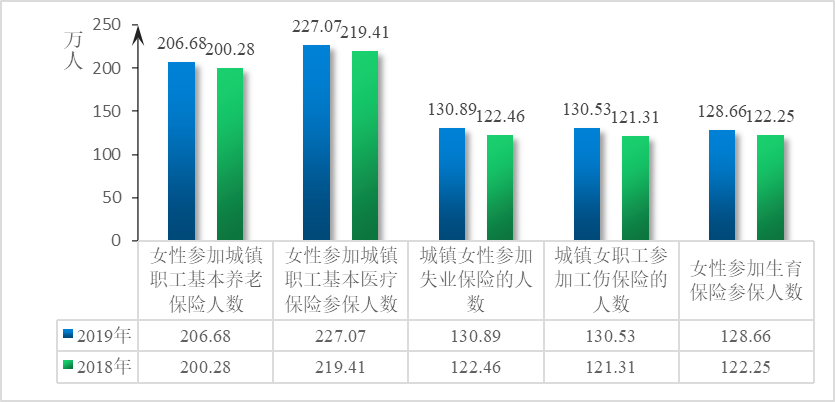 1.保险覆盖不断扩大。“五大险种”参保总数为2234.54万人次,同比增长4.62%,投保覆盖面超过98%。城乡基本医疗保险参保人数为765.35万人,其中女性参加城镇职工基本医疗保险人数为227.07万人,增长3.49%;城乡基本养老保险覆盖率为98.6%,参保人数为560万人,其中女性参加城镇职工基本养老保险人数为206.68万人,增长3.20%;失业保险覆盖率为98.71%,投保人数为308.64万人,其中女性130.89万人,增长6.88%;工伤保险投保人数为301.74万人,其中女性为130.53万人,增长7.60%;生育保险参保人数为298.81万人,增长7.18%。其中女性128.66万人,增长5.24%。