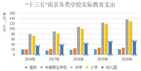 2.经费投入持续加大,预算收入逐年增长。一是从预算收入看,“十三五”市属各级各类学校教育经费预算收入累计达到1569.83亿元注1,年平均增长12.84%。其中,市属普通高校累计预算收入102.58亿元,年平均增长3.41%。全市中等职业学校累计预算收入124.37亿元,年平均增长7.42%。中学累计预算收入547.17亿元,年平均增长14.19%。小学累计预算收入502.97亿元,年平均增长15.50%。幼儿园累计预算收入218.49亿元,年平均增长12.36%。二是从实际支出看,“十三五”各级各类学习累计支出1546.57亿元,年平均增长12.71%。其中,市属普通高校累计实际支出98.57亿元,年平均增长1.14%。中等职业学校累计支出121.50亿元,年平均增长9.35%。中学累计支出537.80亿元,年平均增长14.75%。小学累计支出498.36亿元,年平均增长15.45%。幼儿园累计支出216.75亿元,年平均增长11.88%。