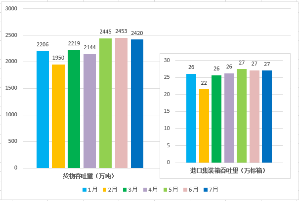 自去年四季度开始,南京港集团新生圩码头进行改扩建场地施工,无法正常作业,再加上疫情影响,各码头用工陆续减少,正常作业量下降,导致1-7月全市港口吞吐量与去年同期比下降2.3%。但集装箱运输需求较大,受不利因素影响较小,总体运行保持平稳,1-7月全市港口集装箱吞吐量181万标箱,同比增长1.3%,增幅比上月提升0.3个百分点。纵观港口货物吞吐量、集装箱吞吐量今年内各月当月数据,除2月份恰逢春节休假,当月规模较低之外,其余月份运营规模基本保持平稳。
