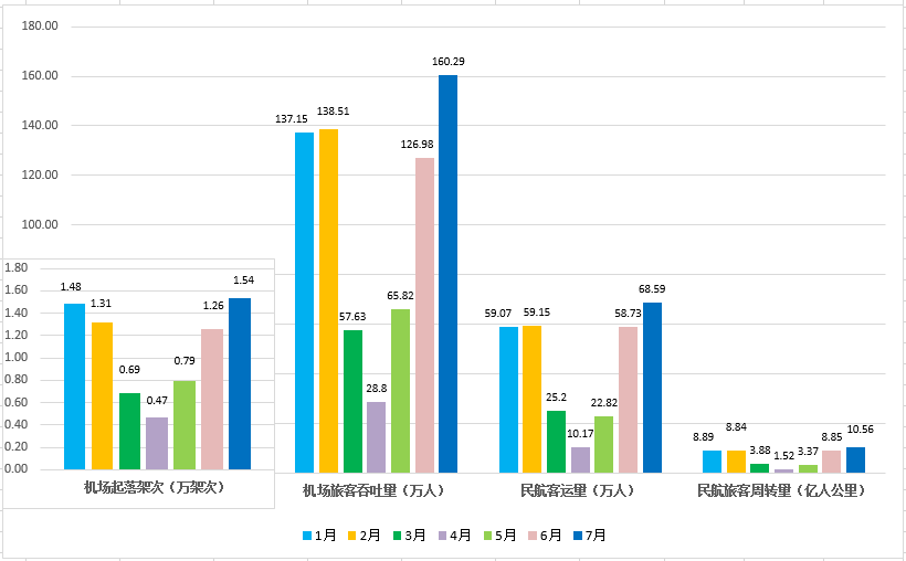 今年以来,在国内疫情不断反复的影响下,南京禄口国际机场运行在年初短暂回暖之后,3月各项主要指标全线下滑,4月筑底。7月随着疫情防控成果的持续巩固,再叠加暑期旅游出行增多影响,全市民航运输开始回暖。7月当月,禄口机场共保障各类飞行1.54万架次,环比增长22.0%;完成旅客吞吐量160.29万人,环比增长26.2%。其中:民用航空运输(航空公司江苏公司部分)7月当月完成客运量68.59万人,环比增长16.8%;旅客周转量105552.35万人公里,环比增长19.3%。且这四个指标7月当月规模均为今年前7个月最高。