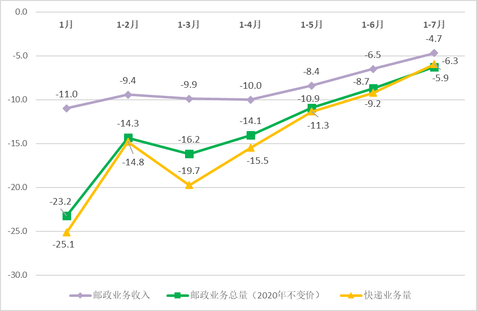 1-7月,全市邮政行业业务收入(不包括邮政储蓄银行直接营业收入)累计完成76.04亿元,同比下降4.7%,降幅比上月收窄1.8个百分点;业务总量(按2020年不变单价计算)累计完成65.26亿元,同比下降6.3%,降幅比上月收窄2.4个百分点。
