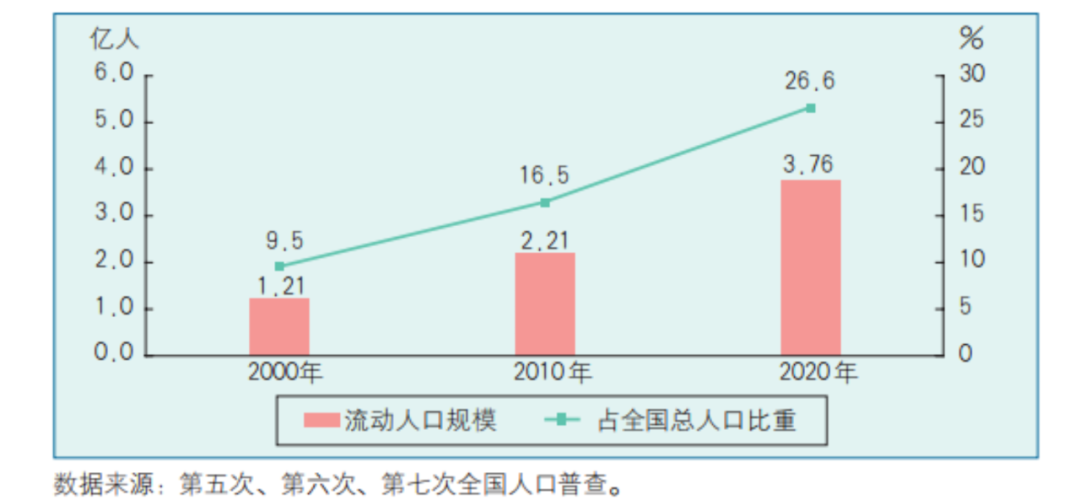 进入21世纪以来,我国流动人口迅猛增长。如图1所示,2000—2020年,流动人口从1.21亿人增加到3.76亿人,20年间增长了211%。流动人口已随处可见,平均每四个人中就有一人是流动人口,这是我国当前人口发展变化最显著的特征之一。