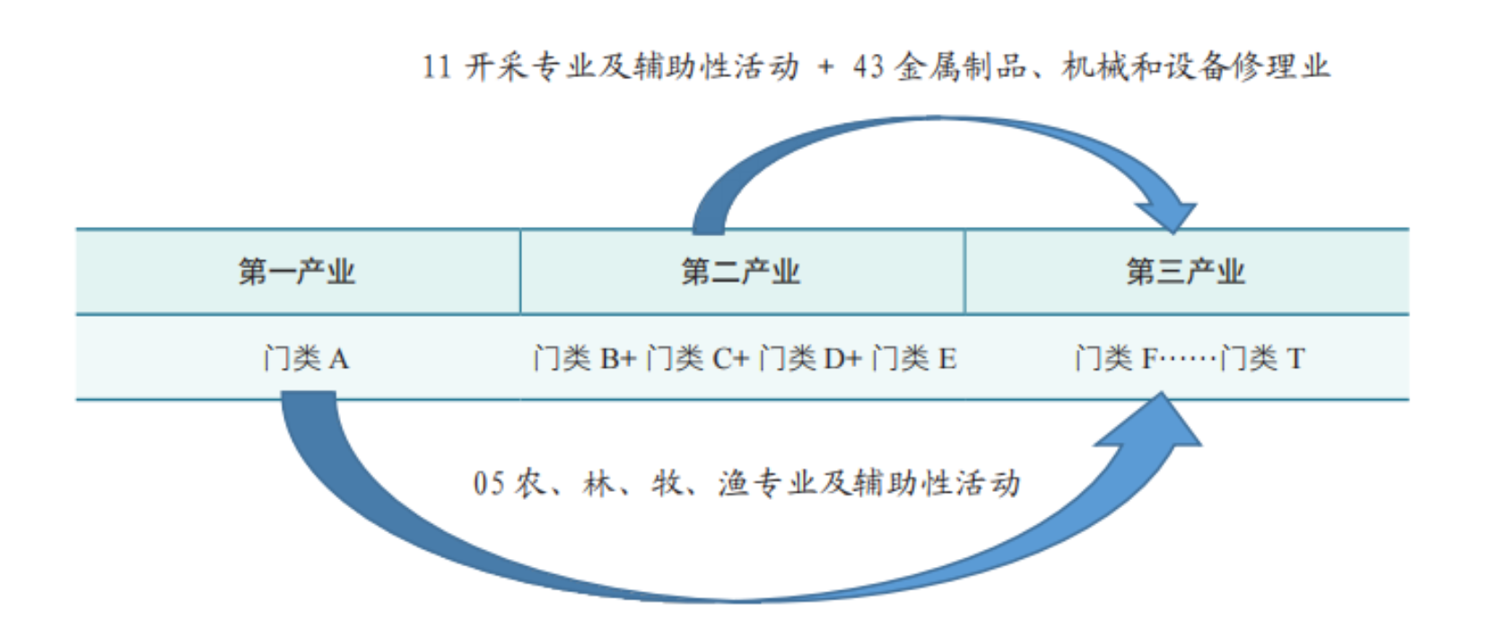 三次产业的划分大致按照国民经济行业分类门类的顺序依次归类,其中,比较特殊的是,将A门类“农、林、牧、渔业”中的大类“05农、林、牧、渔专业及辅助性活动”,B门类“采矿业”中的大类“11开采专业及辅助性活动”,C门类“制造业”中的大类“43金属制品、机械和设备修理业”等三个大类界定为第三产业(如图1)。(来源:国家统计局网站)